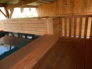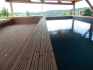 The salt water swimming pool is 9 meters long, half covered and from April until  October heated till 28 °C.