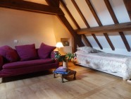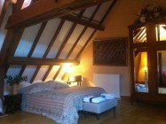 has on the ground floor a very spacious, fully equipped kitchen. On the first floor is the large romantic master bedroom with double bed, free-standing bath, fireplace and balcony where a French breakfast in the morning sun really is divine. If we continue on the spiral staircase we first have a bathroom with shower and toilet and then find the door to the large attic room with a double bed and two single beds. This loose beds can also be placed elsewhere in the House. In the upper part of the tower is a secret Tower room with single bed, always an exciting place for children.